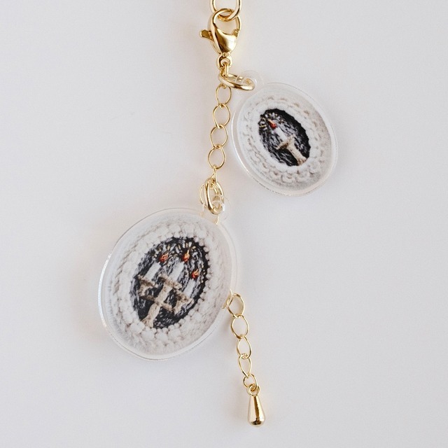 Acrylic Charm : framed candle アクリルチャーム「フレームキャンドル」 刺繍キャンドルブローチをアクリルチャームにしました。 ボールチェーンが長い場合は、ニッパーなどでカットして長さを調節してください。 また、カニカン部分で外して更に小さなチャームとしてもご利用いただけます。 バッグやポーチ、お気に入りの文具などに付けてお楽しみください♪ size:全長約100mm (チャーム金具含む) material:アクリル、チャーム金具、ボールチェーン ※「お買い物前に必ずお読みください。」をよく読んだ上、ご了承のもとご購入ください。 ——————————————— Acrylic Charm: Framed Candle Our embroidered candle brooch has been turned into an acrylic charm, featuring a framed candle design. If the ball chain is too long, you can easily cut it with nippers or pliers to adjust the length. You can also remove the lobster clasp to use it as an even smaller charm. Attach it to your bag, pouch, or favorite stationery and enjoy it in your own way. Size: Approx. 100mm total length (including charm fittings) Materials: Acrylic, metal charm fittings, ball chain ※ Please be sure to read “Before Purchasing” carefully and proceed with your order only after understanding the details.