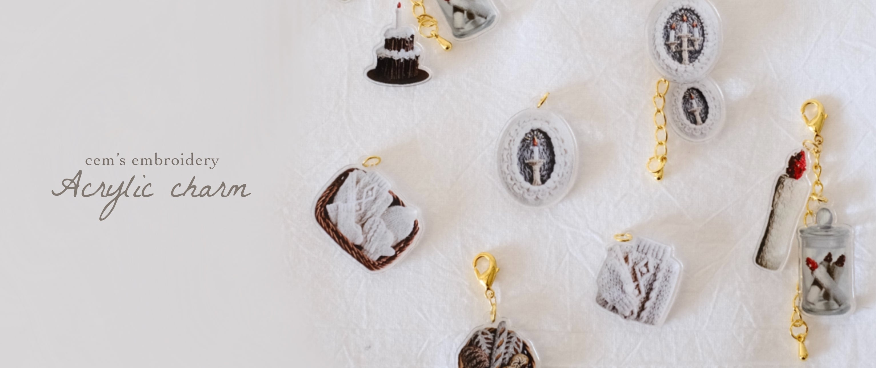 Acrylic Charm : framed candles アクリルチャーム「フレームキャンドル」 刺繍キャンドルのブローチをアクリルチャームにしました。 とっても小さな2連のアクリルパーツがかわいいです。 バッグやポーチに付けてお楽しみください♪ ナスカンが小さくてバッグの持ち手などに付けられない場合は、ボールチェーンやカラビナを通していただくと付けられますのでお試しください。 size:全長約90mm (チャーム金具含む) material:アクリル、チャーム金具 ※「お買い物前に必ずお読みください。」をよく読んだ上、ご了承のもとご購入ください。 ——————————————— Acrylic Charm: Framed Candles Our embroidered candle brooch has been reimagined as an acrylic charm. The two tiny linked acrylic pieces create a sweet and delicate design. Attach it to your bag or pouch and enjoy it as a small decorative accent. If the lobster clasp is too small to attach directly to a bag handle, try using a ball chain or carabiner for easier attachment. Size: Approx. 90mm total length (including charm fittings) Materials: Acrylic, metal charm fittings ※ Please be sure to read “Before Purchasing” carefully and proceed with your order only after understanding the details.