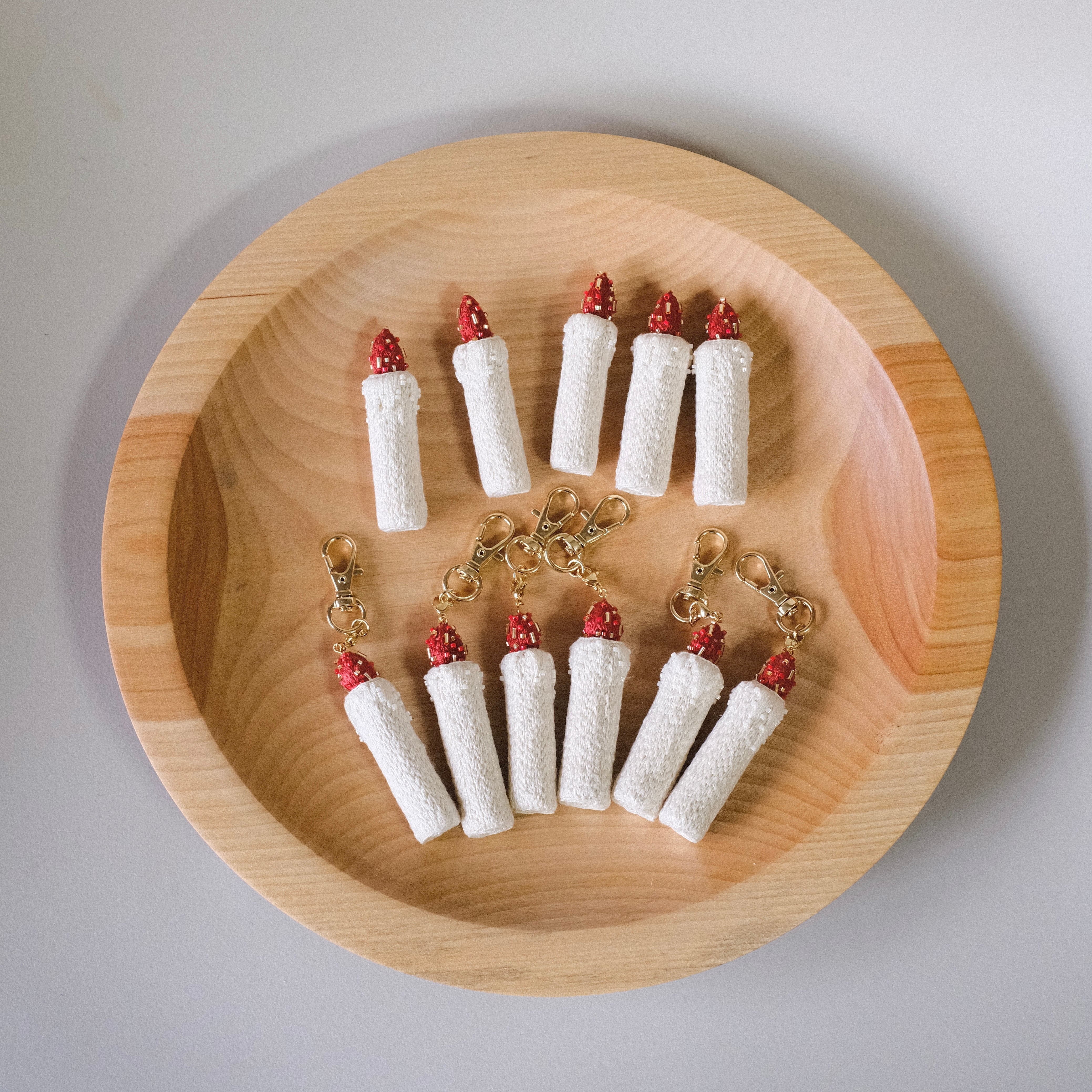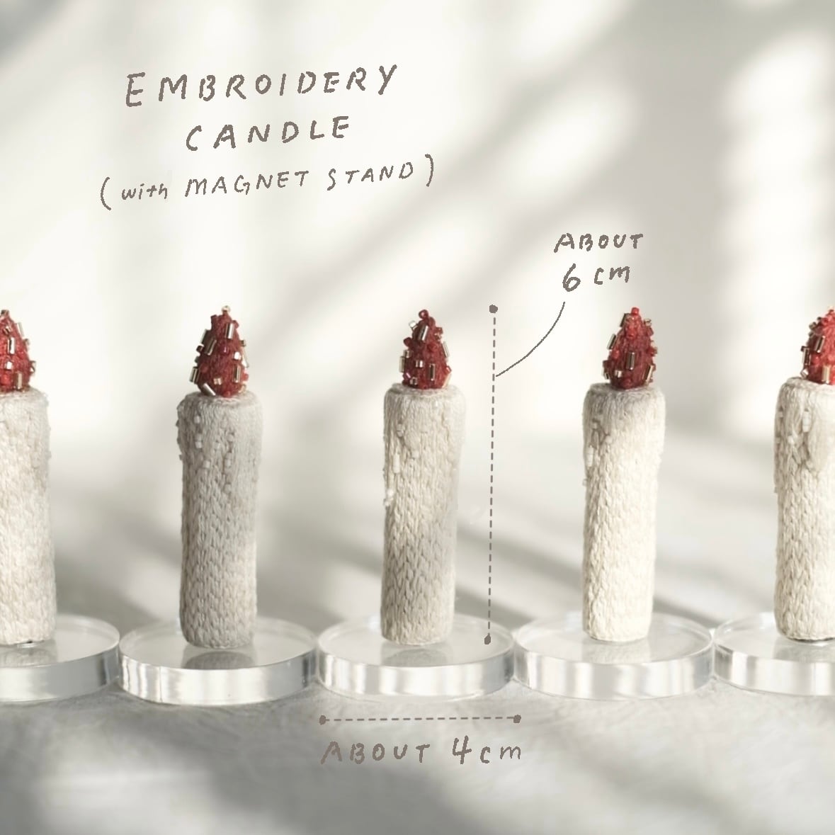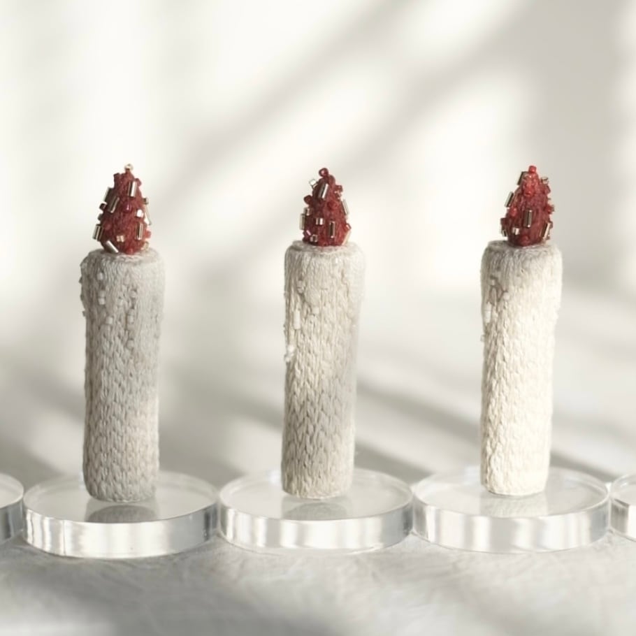 全て手刺繍のキャンドルです。一粒一粒縫い付けたガラスビーズがキラっとポイントになっています。底にはマグネットが仕込んであるため、マグネットスタンドの上に自立します。