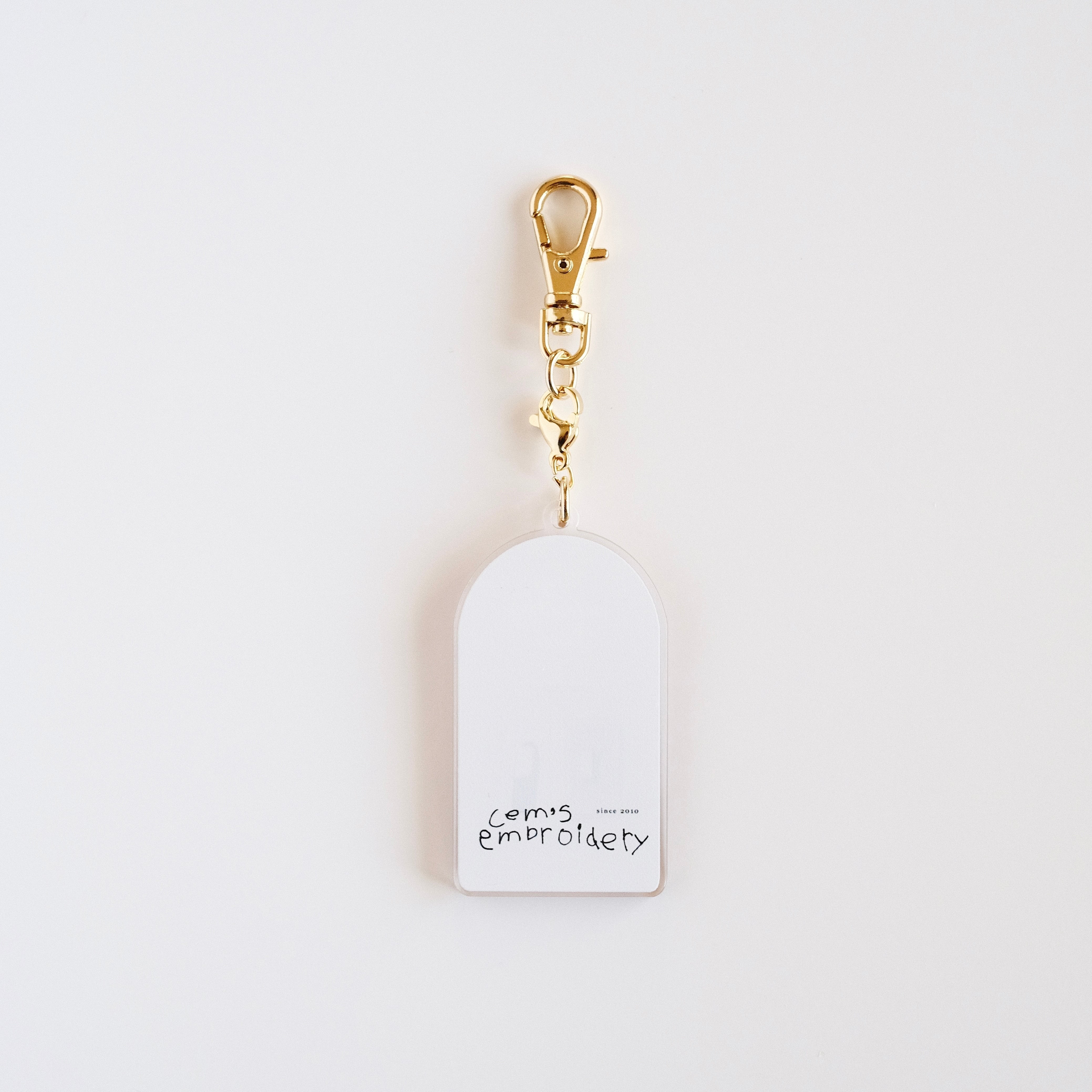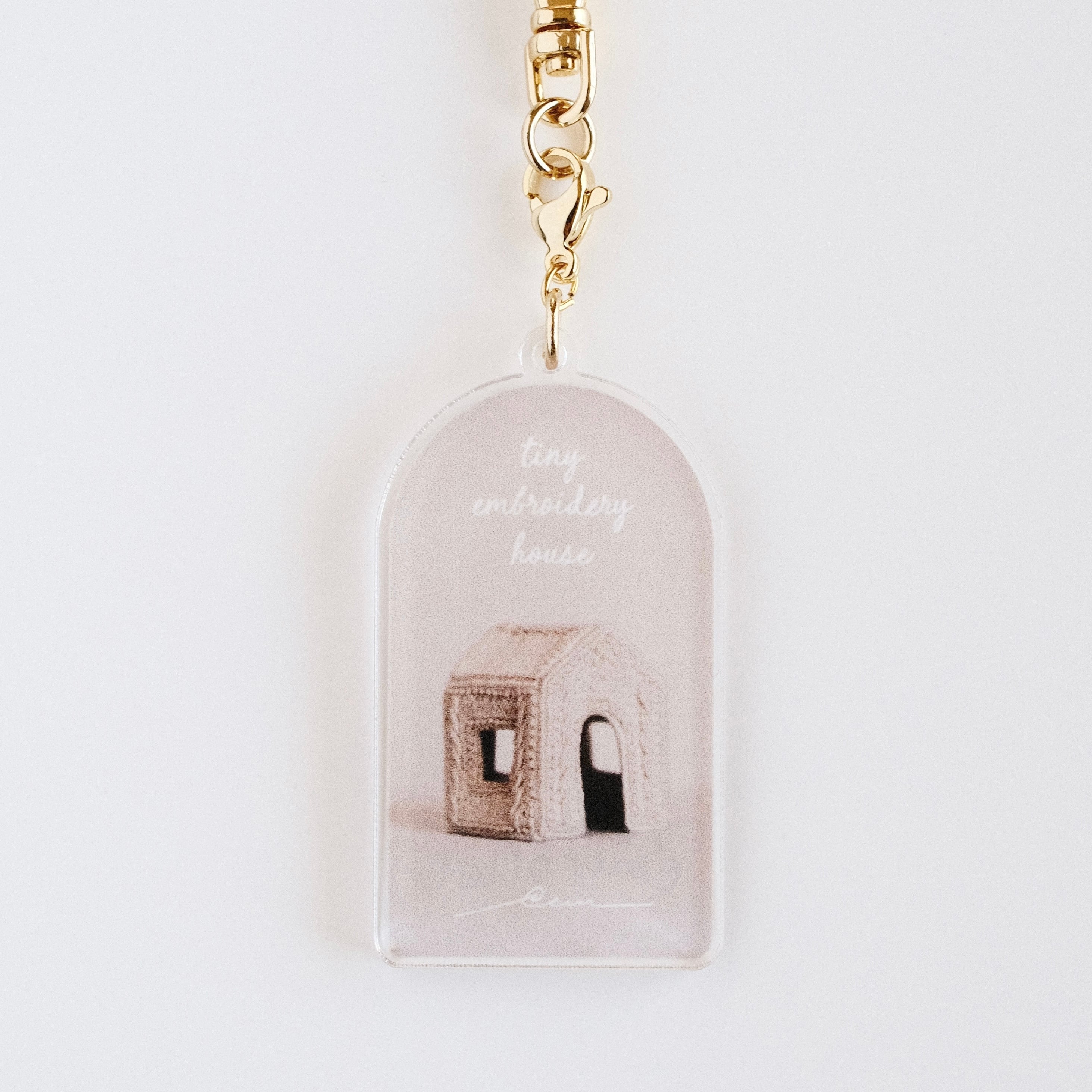 Our tiny embroidered house ornament has been turned into an acrylic charm.