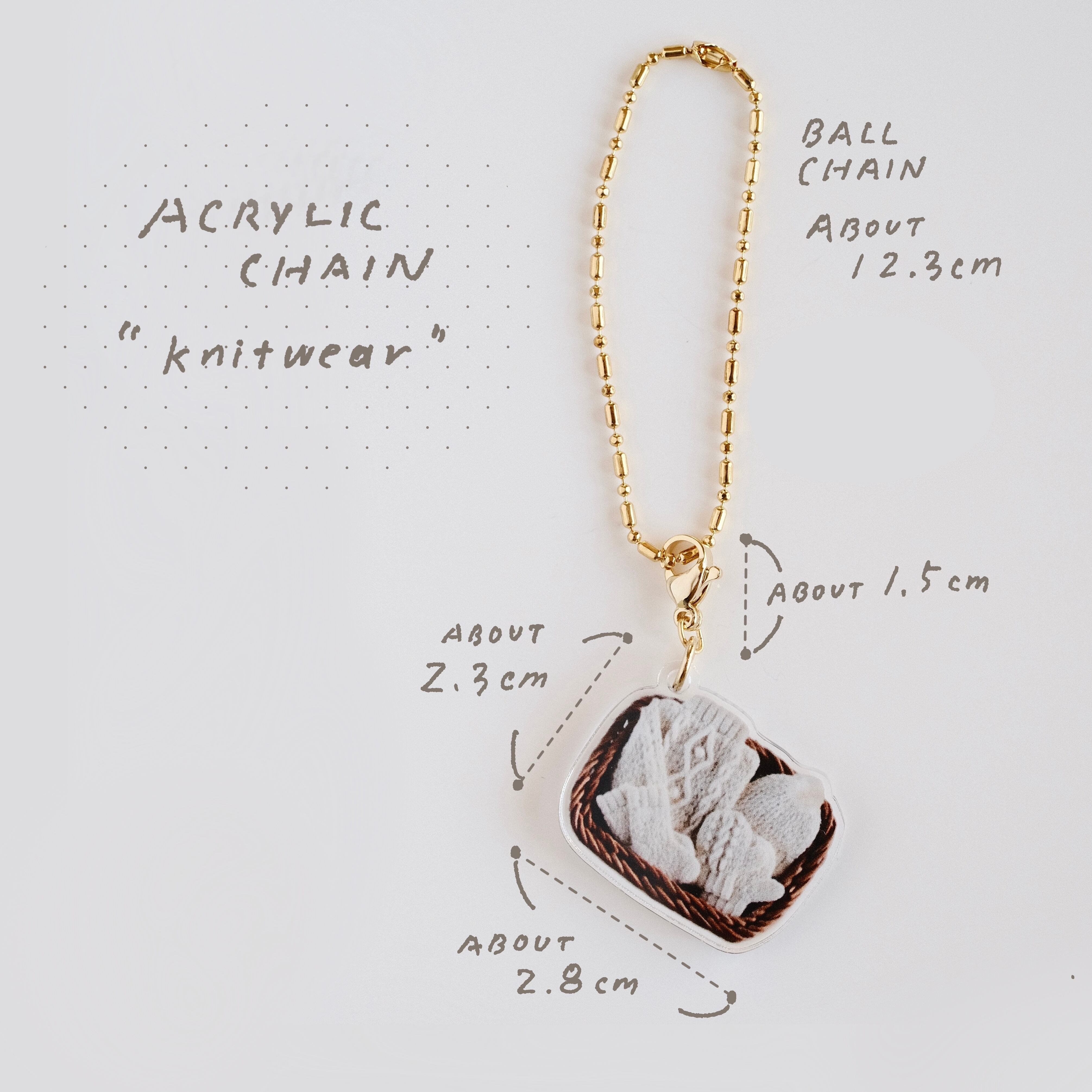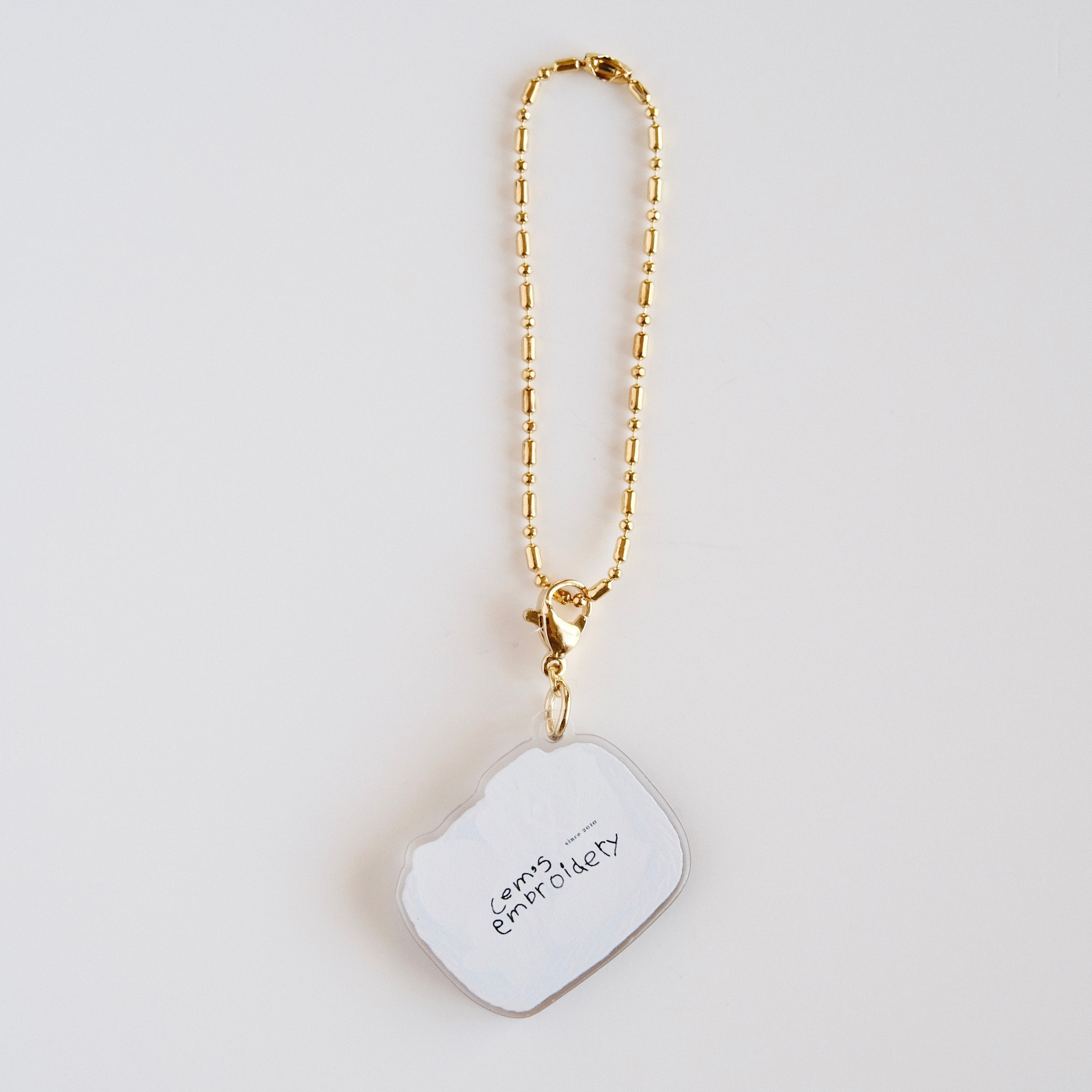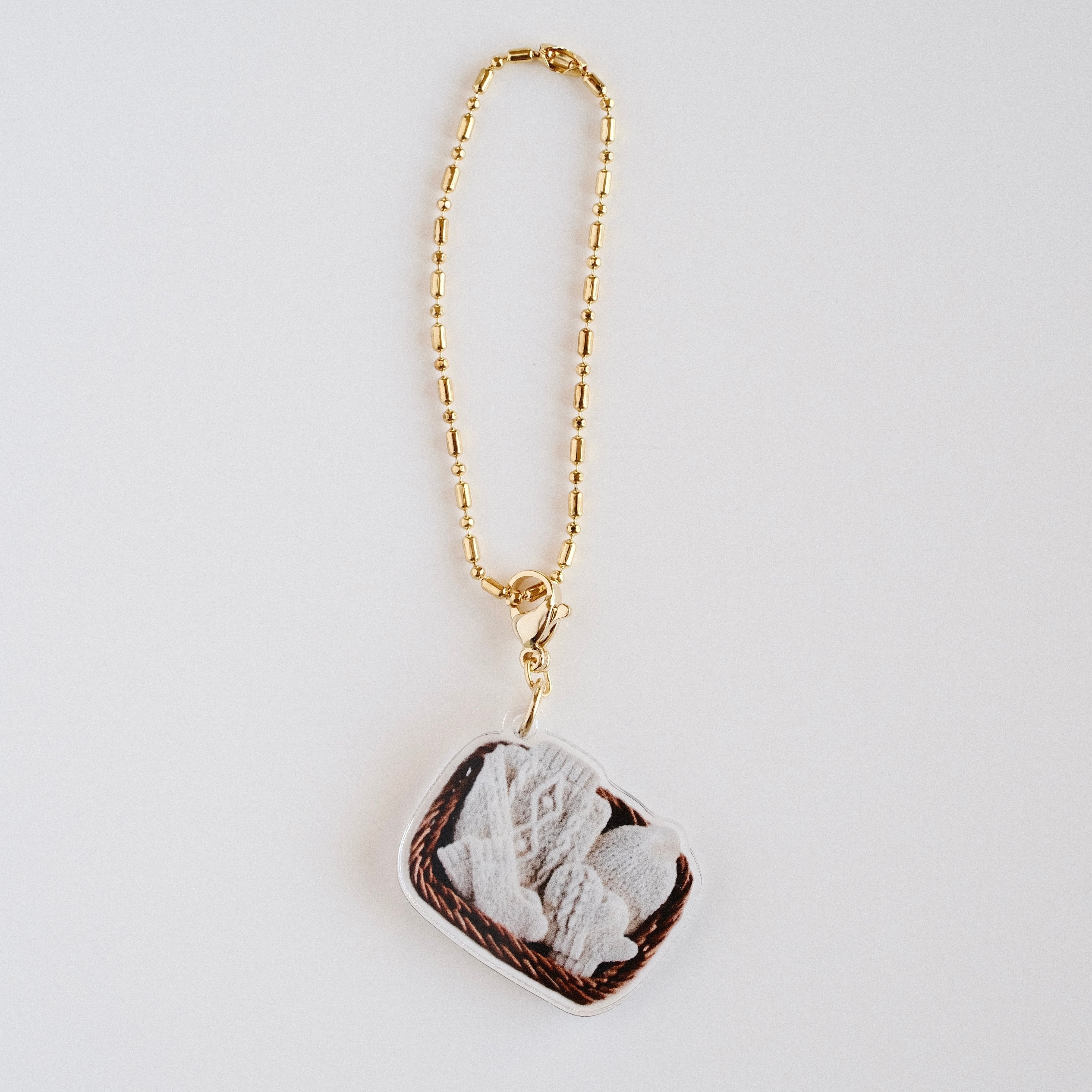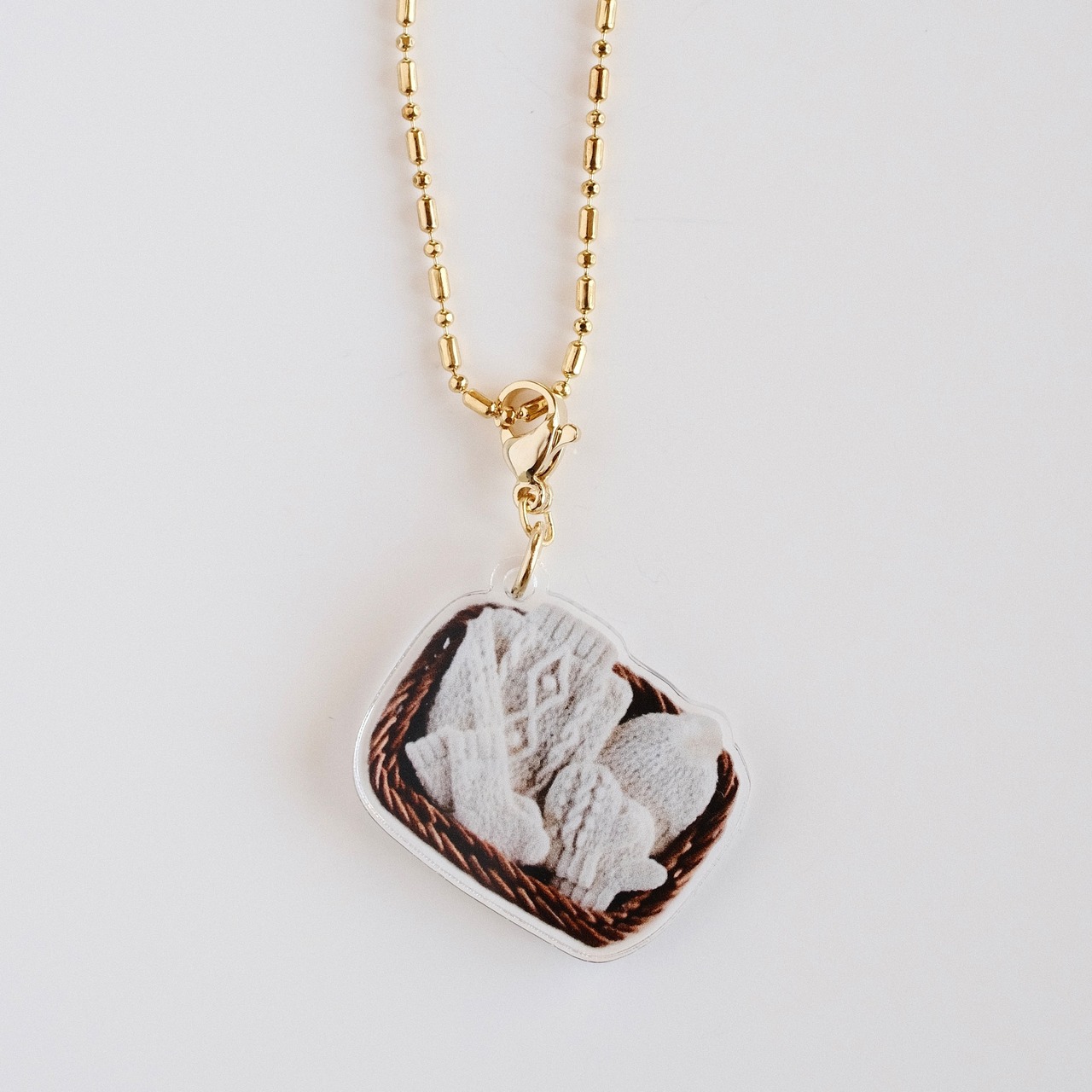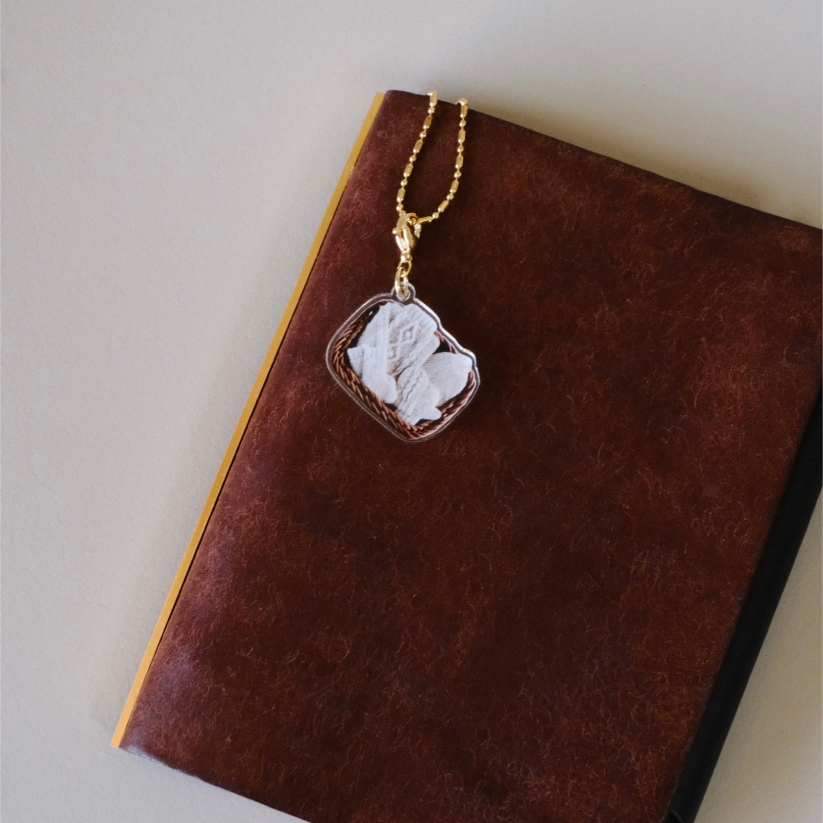 Our embroidered knit brooch has been turned into an acrylic charm, inspired by cozy winter preparations.